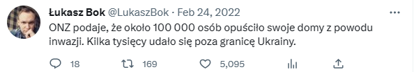Rysunek 1. Wpis o liczbie uchodźców – Łukasz Bok, platforma X (24.02.2022).