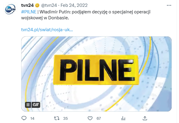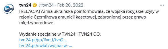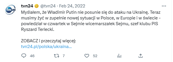 Rysunek 22. Wpis z linkiem zewnętrznym – TVN24, platforma X (24.02.2022).