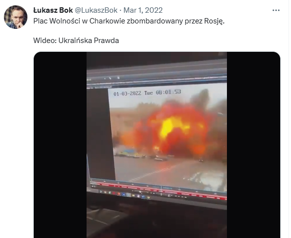 Rozpoczęcie wojny było zasygnalizowane przez badane przeze mnie profile np. poprzez wspomniane wcześniej poinformowanie o treści wystąpienia Władimira Putina. Zarówno Łukasz Bok, jak i TVN24 przytoczyli słowa prezydenta Rosji, informując tym samym swoich odbiorców o początku wojny Rosji z Ukrainą na pełną skalę. Każdy z nich zacytował słowa Władimira Putina, aby dokładnie przekazać użytkownikom portalu X o jego bezpośrednich zamiarach wojennych. Następnie, autorzy zarówno pierwszego, jak i drugiego profilu informowali swoich odbiorców o kolejnych działaniach konfliktu, konkretnych wybuchach, strajkach, walkach, ofiarach i krokach, które podejmowały w sprawie z tą wojną inne państwa, chociaż każdy z autorów robił to na swój sposób.