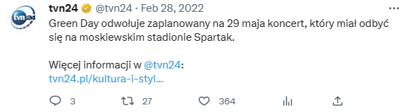 W tym przypadku TVN24 opisał na przykład kwestię kulturalną od strony wydarzenia muzycznego. Przedstawił, że amerykański zespół punkrockowy nie zagra na zaplanowanym podczas trasy koncertowej wydarzeniu, które miało odbyć się w Rosji.
