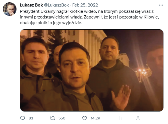 Rysunek 20. Wpis o prezydencie Ukrainy – Łukasz Bok, platforma X (25.02.2022).