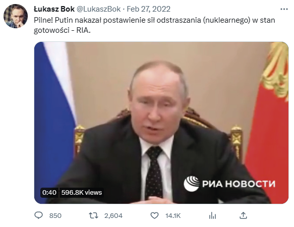 Rysunek 21. Wpis o prezydencie Rosji – Łukasz Bok, platforma X (27.02.2022).