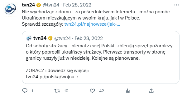 TVN24 w zamieszczanych wpisach społecznych skupił się głównie na kontekście społecznym od strony polskiej. Często poprzez reposty (co pokazane na rycinie) publikował informacje dotyczące wspomnianych wcześniej różnego rodzaju zbiórek, jak można wyczytać z ryciny, nie tylko stacjonarnych, ale także internetowych. Zwrócił większą uwagę na to, jak pomagać Ukraińcom, niż co dokładnie ich spotyka w ich ojczyźnie.