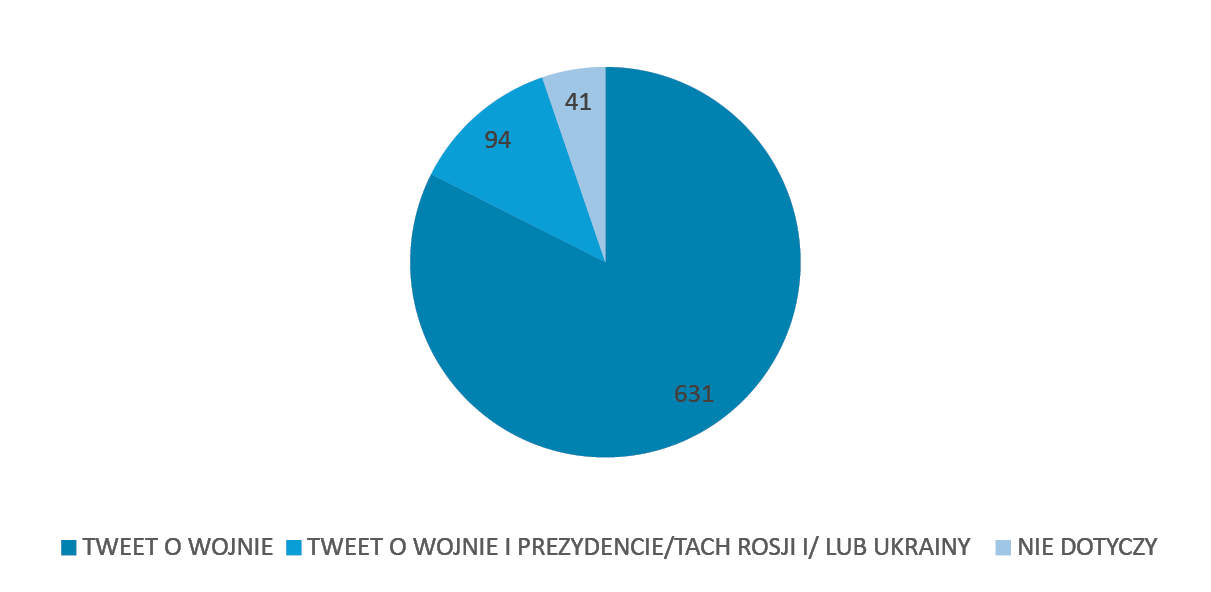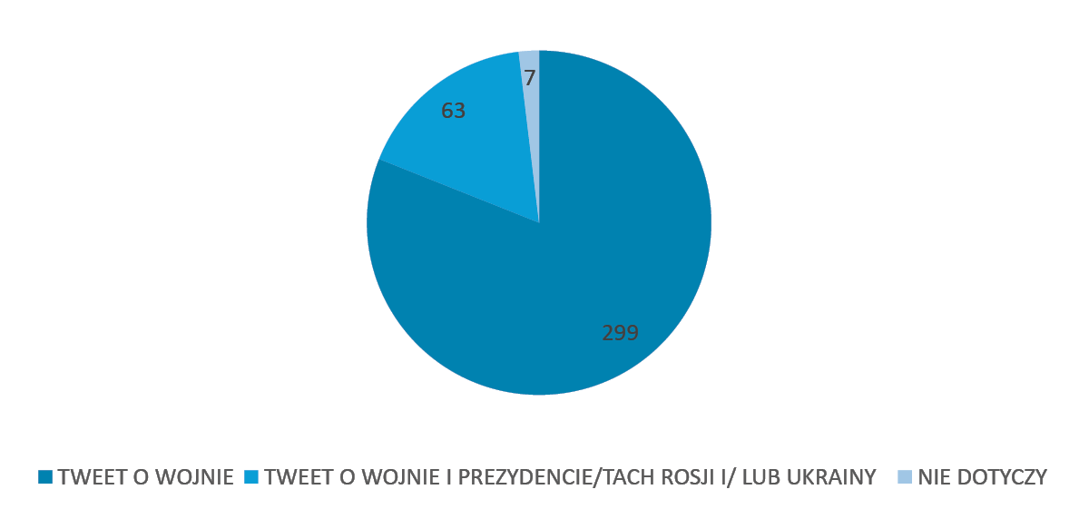 Jak widać na powyższych wykresach, poza wpisami o wojnie i prezydentach Rosji i Ukrainy, badane profile przedstawiały także inne informacje – odrębne od konfliktu Rosji z Ukrainą. W przypadku TVN24 było ich zdecydowanie więcej niż u Łukasza Boka, co może być związane z typowym schematem działania instytucji telewizyjnej, której podlega nadawca na portalu X. Profil zinstytucjonalizowany zamieścił bowiem 41 na 766 wpisów, które nie dotyczyły tego konfliktu, co stanowi trochę ponad 5% wszystkich informacji przekazywanych przez ten profil w pierwszym tygodniu wojny. Nadawca niezinstytucjonalizowany natomiast w pierwszym tygodniu wojny zamieścił 7 z 369, a więc 2% wpisów, które stanowiły przekazy niedotyczące analizowanego przeze mnie zagadnienia. Jednym z nich był wpis o ataku rakietowym Izraela na Damaszek czy informacja o wygranej polskiej tenisistki Igi Świątek na turnieju WTA 1000 w Dosze. Ten przykład pokazuje, że prawdopodobnie autor tego wpisu chciał, żeby jego odbiorcy przy natłoku negatywnych, związanych z wojną informacji mieli chociaż trochę radości i ucieszyli się, że Polka, w tych trudnych czasach, awansowała na czwarte miejsce w światowym rankingu. Można jednak na ten problem spojrzeć inaczej i stwierdzić, że aż, w zaokrągleniu, 98,4% wpisów zamieszczonych w tym okresie przez Łukasza Boka dotyczyło wojny – to ogromna liczba, która najlepiej pokazuje, że w tamtym okresie faktycznie portal X zapełnił się informacjami dotyczącymi wojny. Dzięki temu można zauważyć, że nawet twórca niezinstytucjonalizowany opisywał informacje bieżące i rzadko skupiał się na newsach niedotyczących trudnej sytuacji, w jakiej znalazła się Ukraina. Z kolei TVN24, tak jak wspomniałam wcześniej, częściej niż Łukasz Bok, zwracał uwagę na sprawy niedotyczące wojny, np. na kwestie związane z zakażeniami koronawirusem, chociaż oczywiście nadal najwięcej wiadomości na tym profilu w pierwszym tygodniu wojny było o konflikcie ukraińsko-rosyjskim.