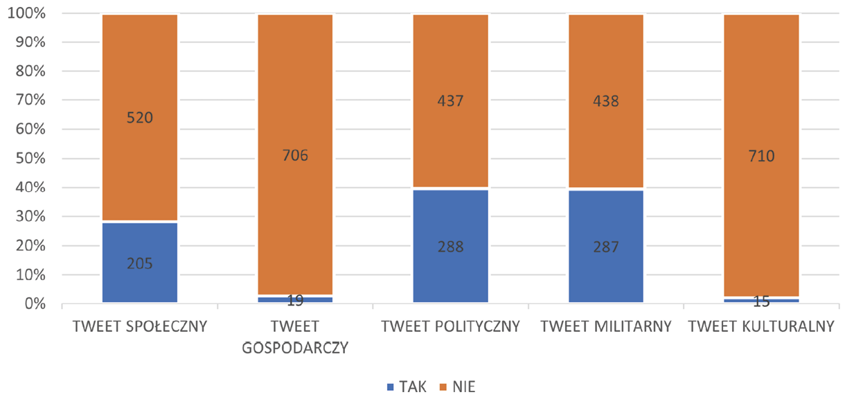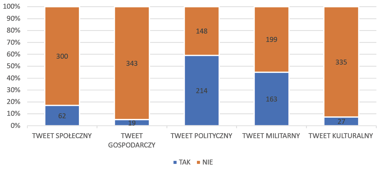 Następnym rozróżnieniem są wpisy militarne. Podobnie jak opisywanych na początku politycznych wpisów, tych było szczególnie dużo na jednym i drugim profilu. Nadawca zinstytucjonalizowany zamieścił ich 40%, a niezinstytucjonalizowany – 45%. Kwestia militarna była bardzo istotna, bo wojna toczy się nie tylko na tle politycznym, ale jednak głównie w wymiarze militarnym. Giną żołnierze, opisywane są kolejne wybuchy czy następne osiągnięte przez rosyjskie wojska cele. Dlatego wpisy klasyfikujące się do tej kategorii dotyczą przede wszystkim: opisów strat ziem, zniszczeń infrastruktury spowodowanej rosyjskim atakiem, kwestii dotyczących przemieszczania się wojsk obu stron, ich sprzętu wojskowego czy strat materialnych i tych w ludziach. Oba profile informują także o stanach wojennych i wyjątkowych (nawet w innych krajach), ustanawianych godzinach policyjnych czy wyjących syrenach alarmowych. Ważne są także zamieszczane opisy: chęci demilitaryzacji, bombardowań, ataków zbrojnych czy nawet cyberataków.